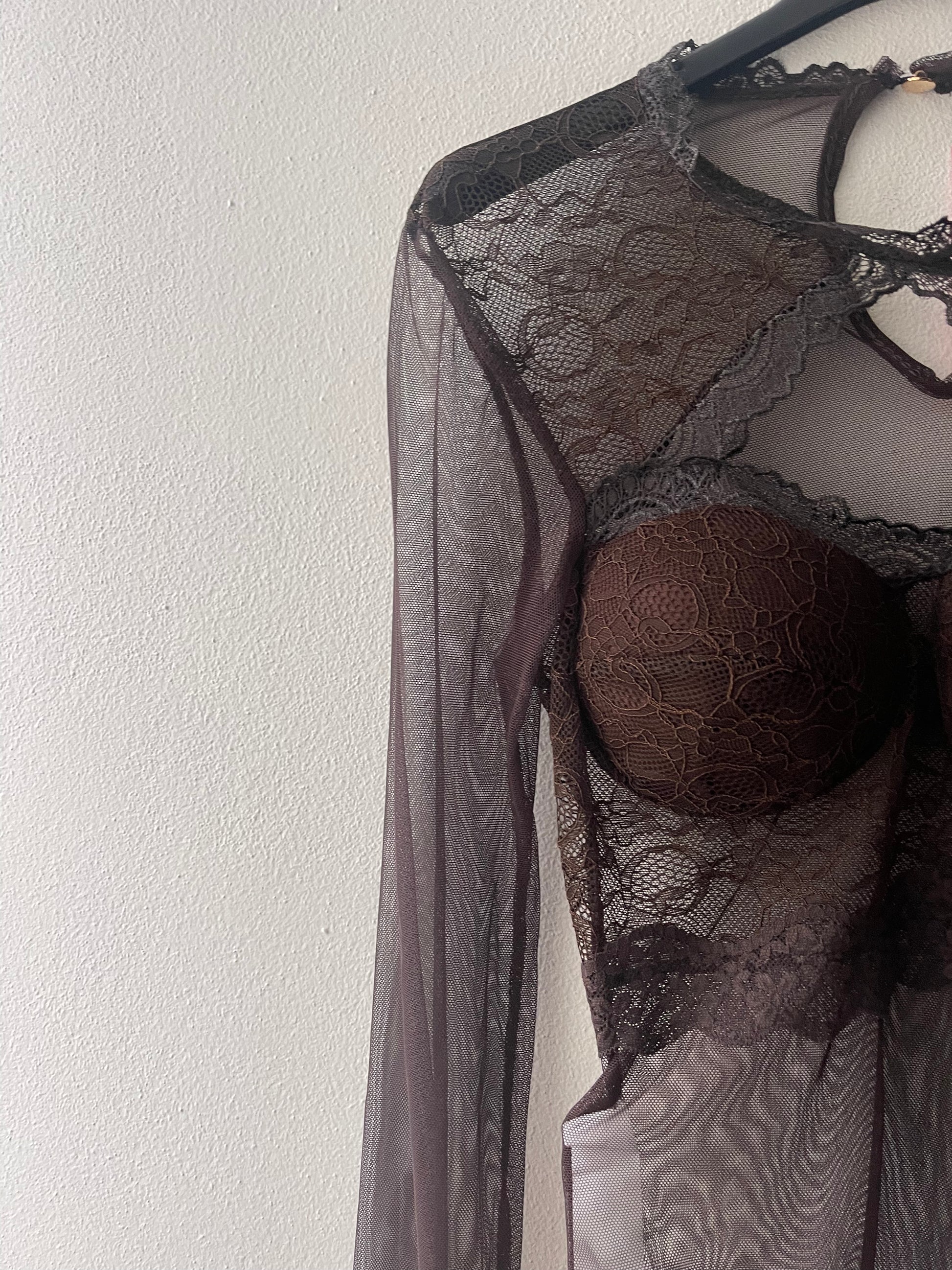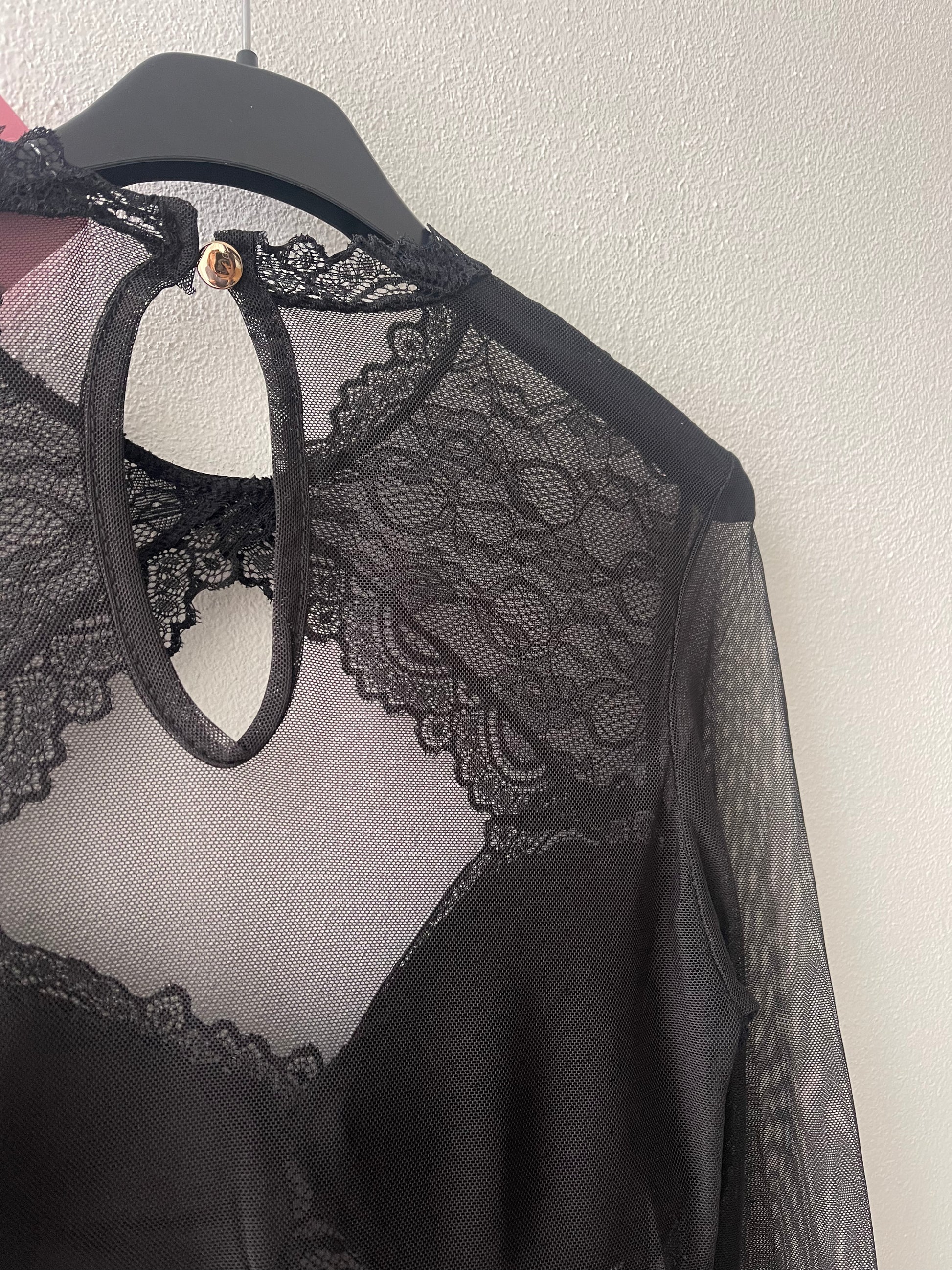 Body con coppe imbottite elasticizzato trasparente sulla parte busto e maniche bottoncino dietro la nuca taglia unica