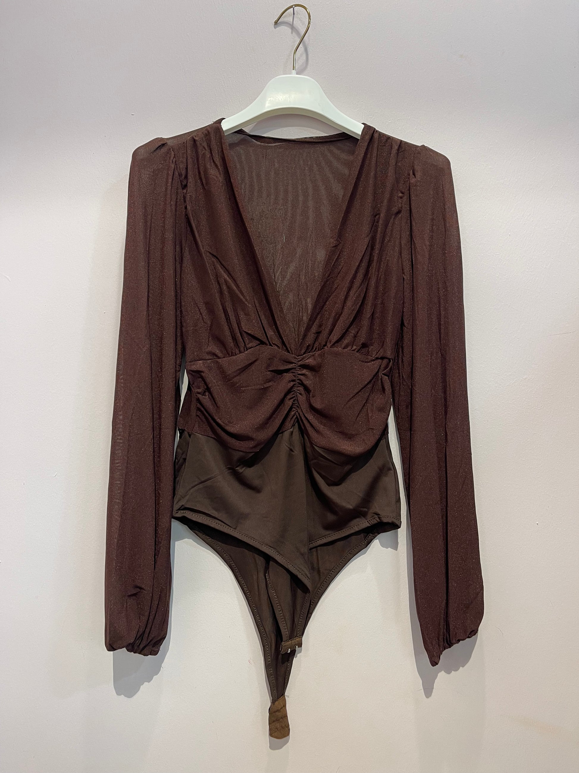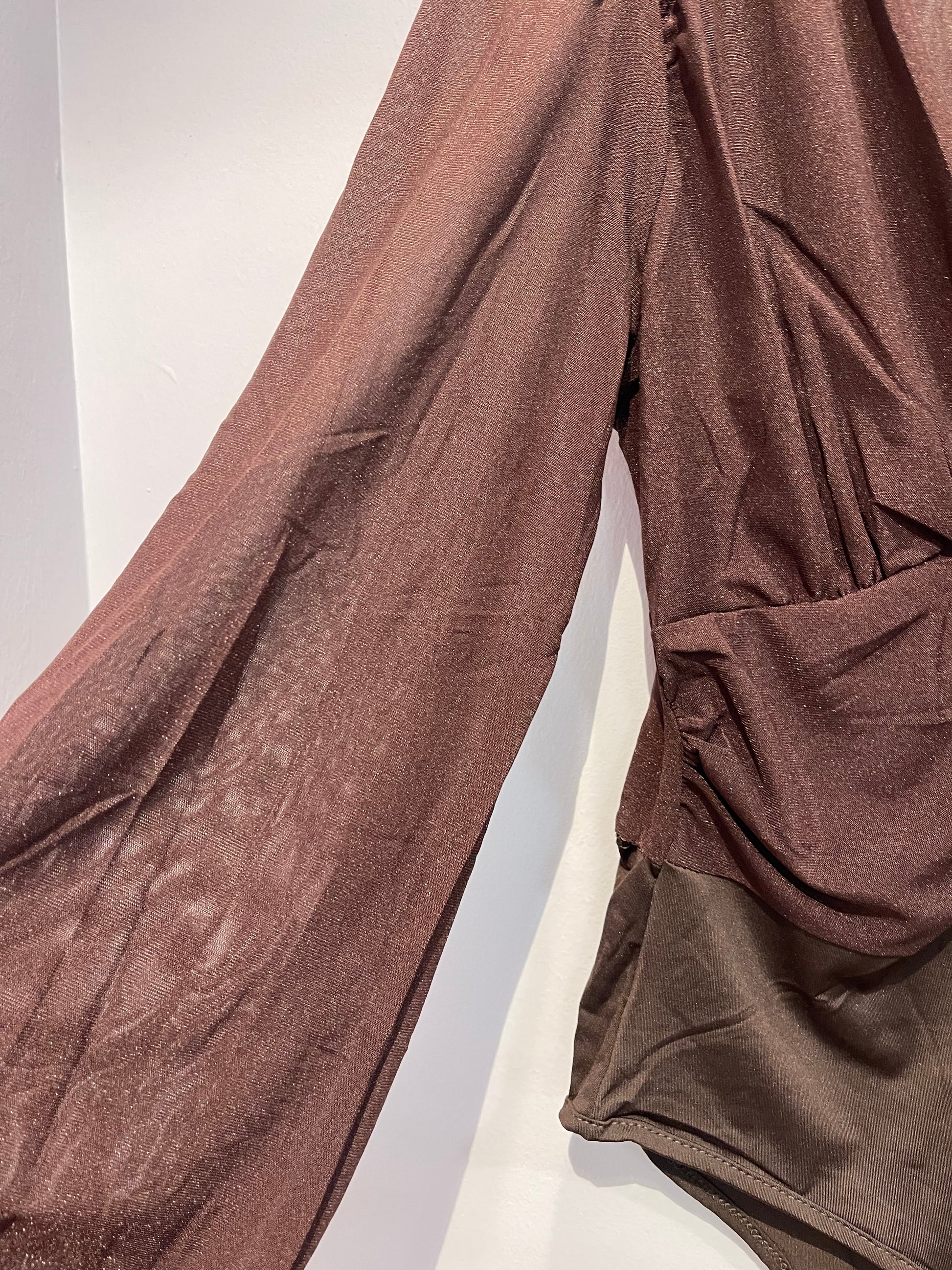 Body elasticizzato con parte sopra semi trasparente manica a lanterna e parte sotto in lycra comodo e adattabile da una taglia 38 ad una taglia 44