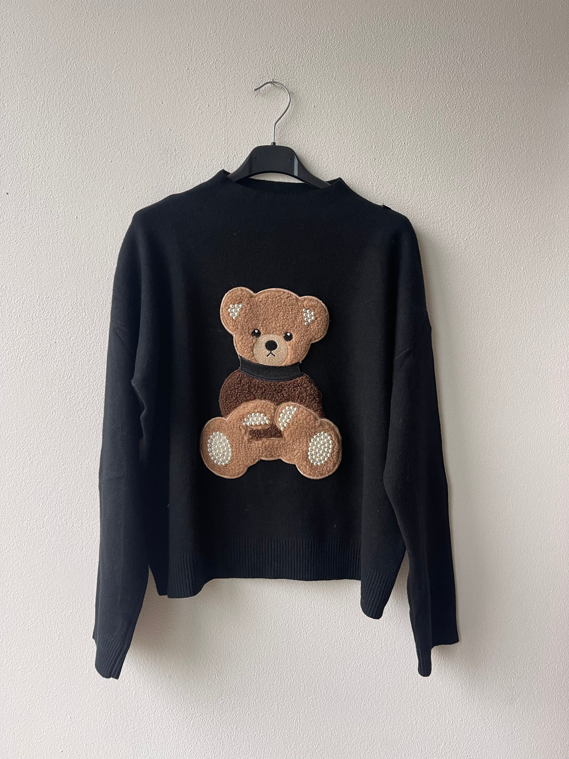 Maglia in viscosa ed elastan con orsetto decoro in ecopelliccia e perle sul davanti