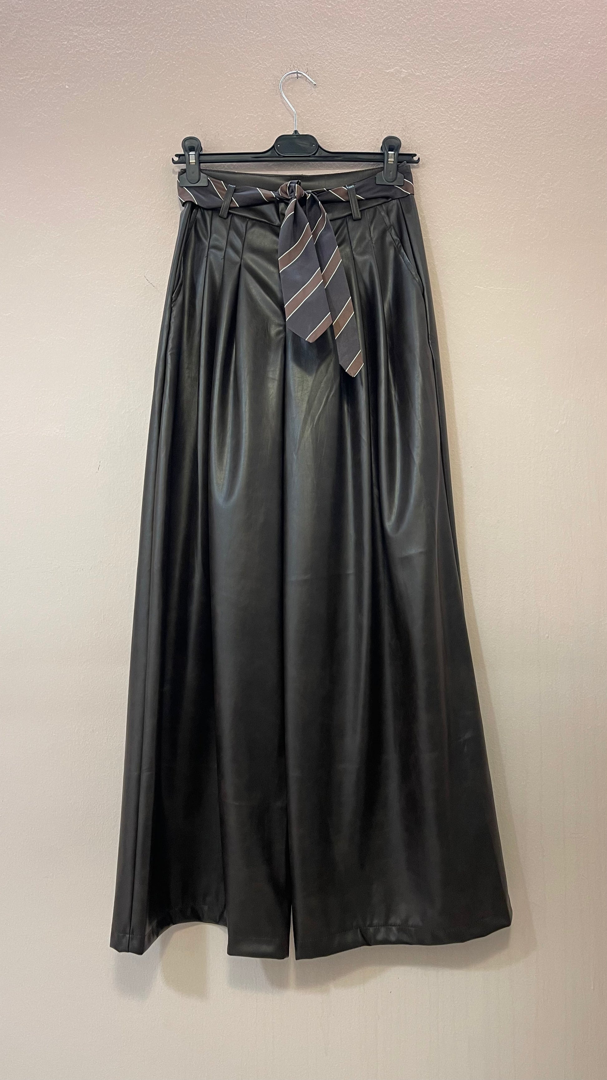 Pantalone palazzo in ecopelle con cintura coordinata colore testa di moro gamba ampia