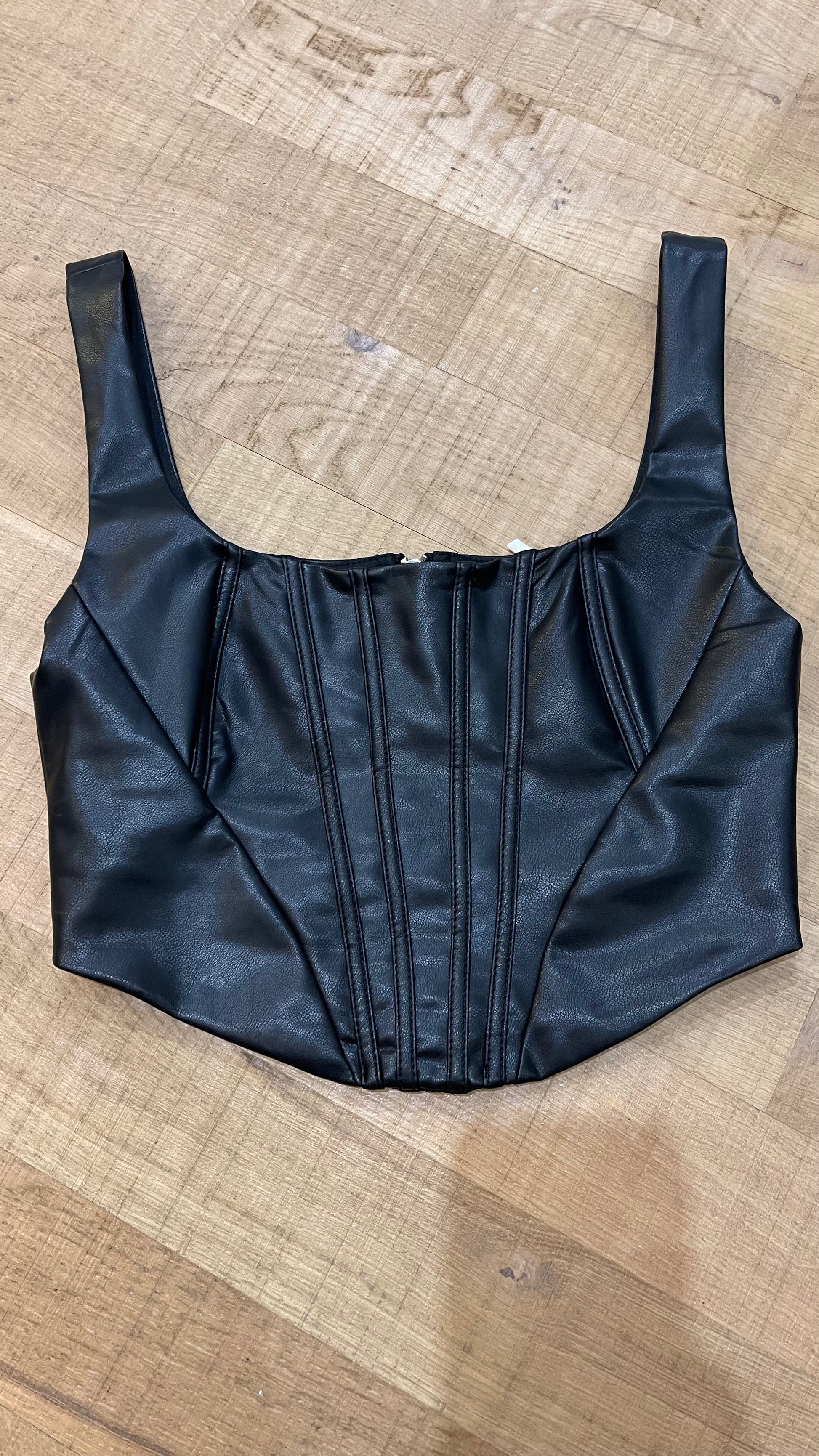Faux leather top with V-neck and zip at the back, wide shoulder strap