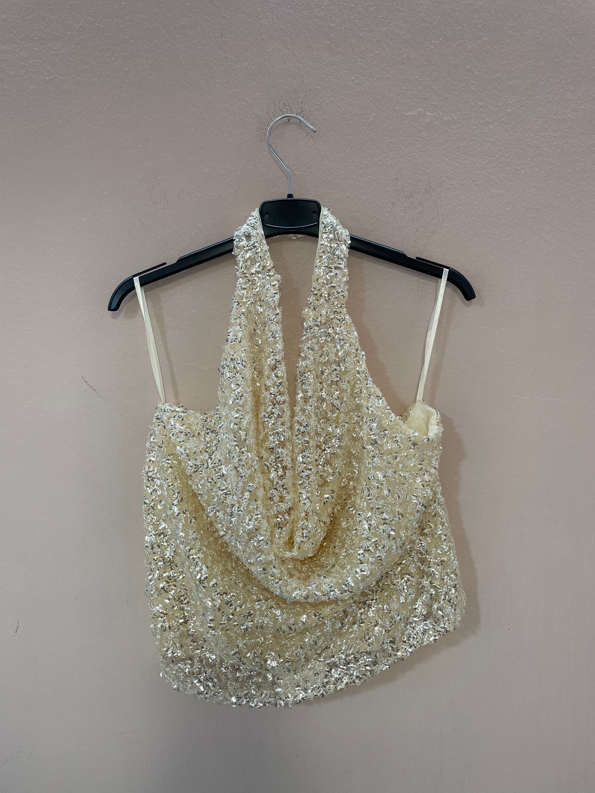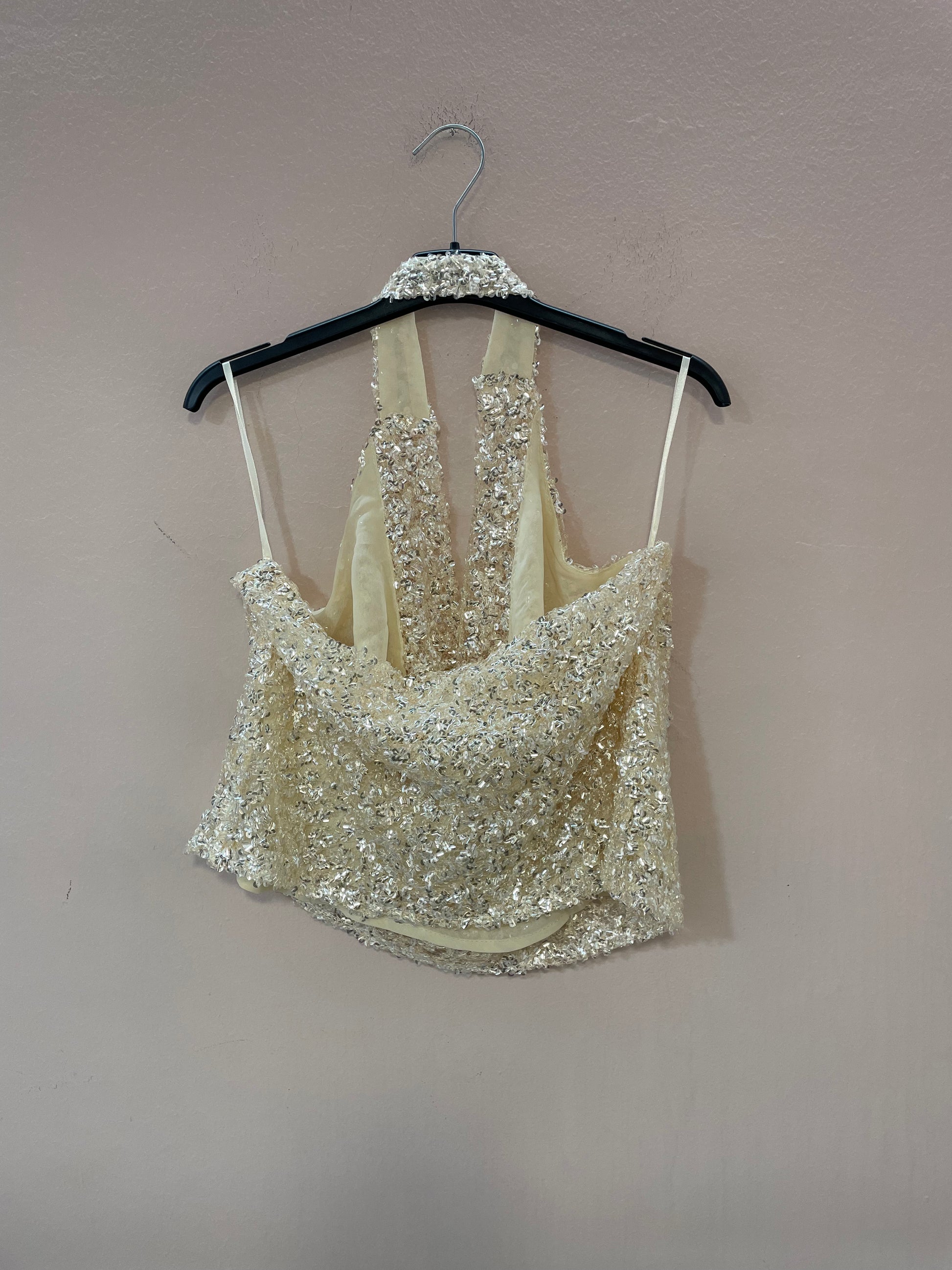 Top con scollo all’americana in paillettes tono su tono. Schiena scoperta
