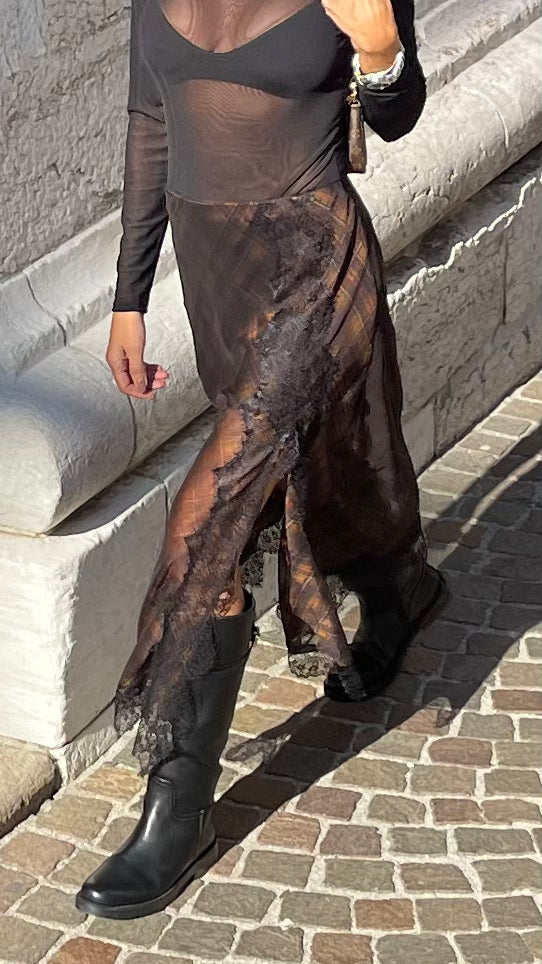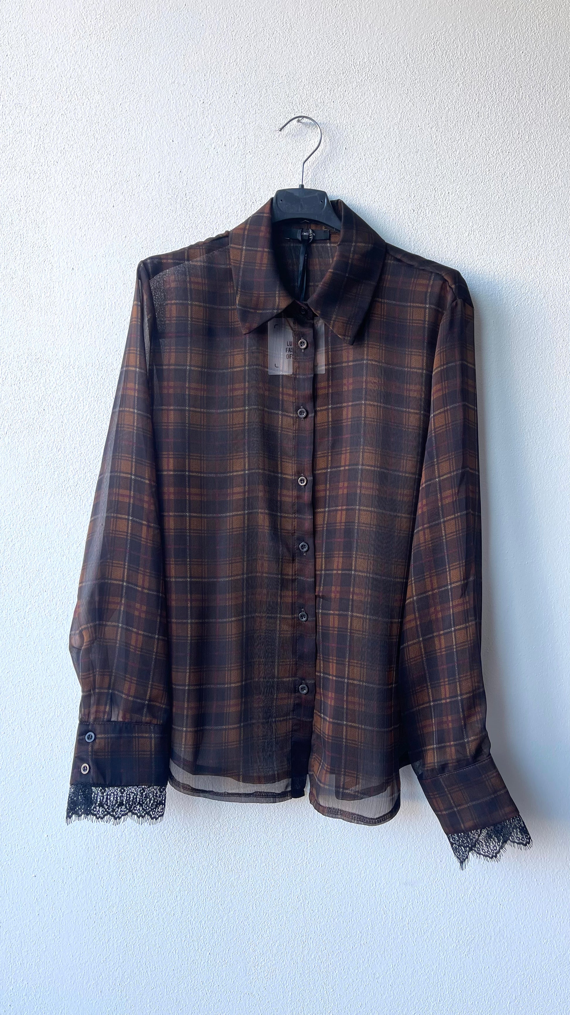 Camicia in tessuto tartan leggero con colletto e dettaglio pizzo sul polsino possibilità di gonna coordinata