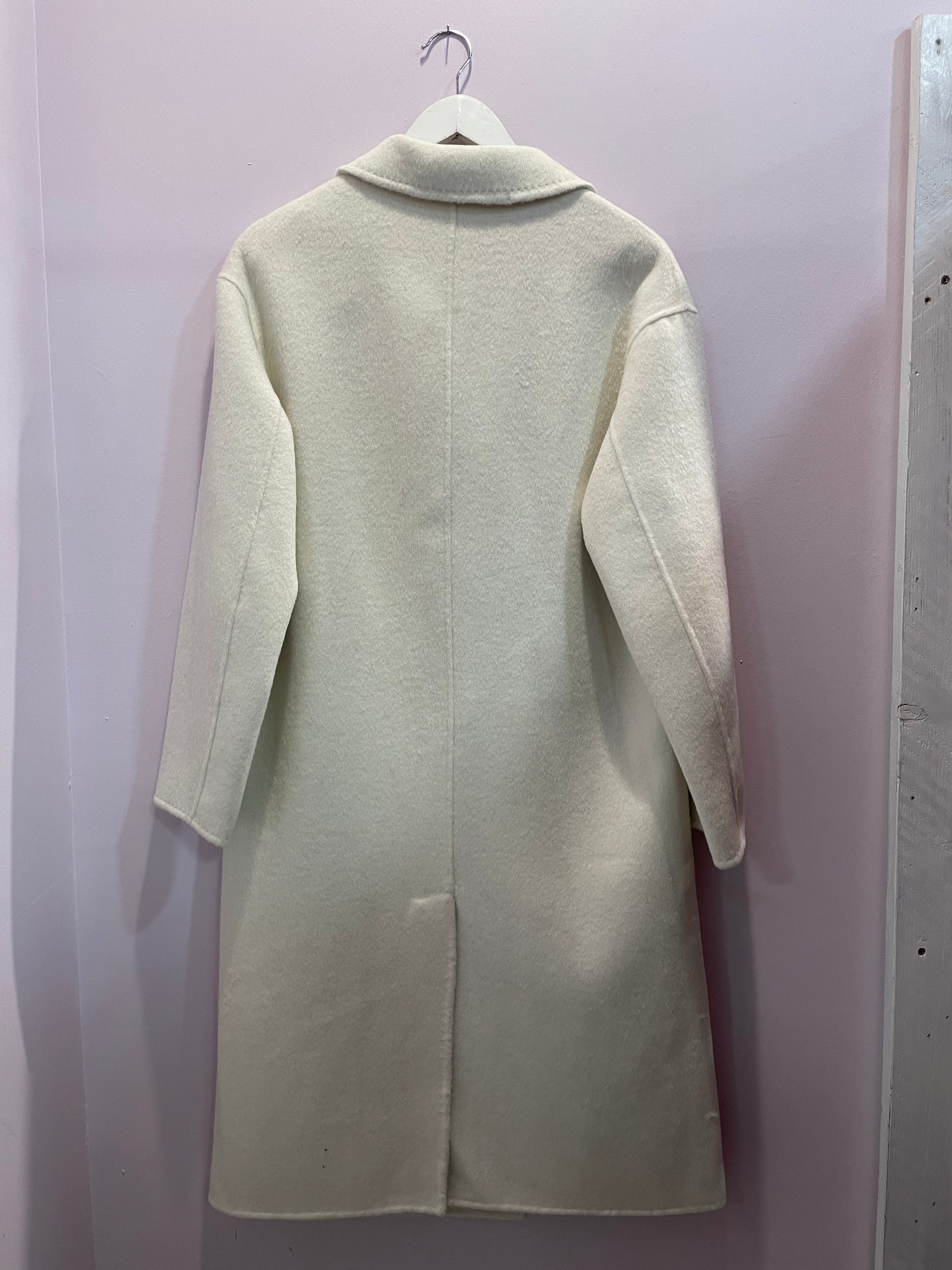 Cappotto in panno doppiato cucito a mano, chiusura doppiopetto