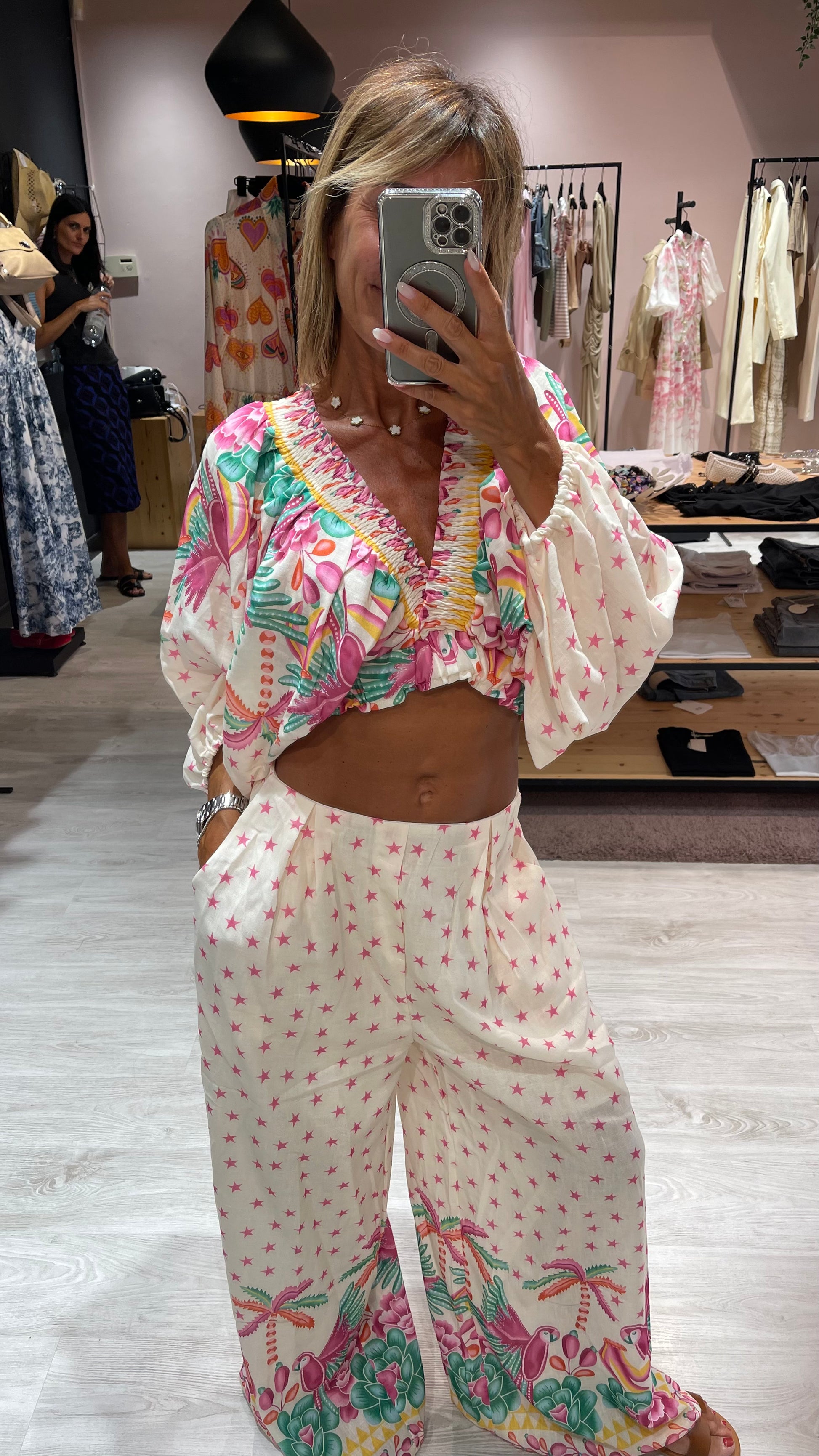 Completo in cotone con top manica a lanterna scollo a V e pantalone morbido con elastico in vita