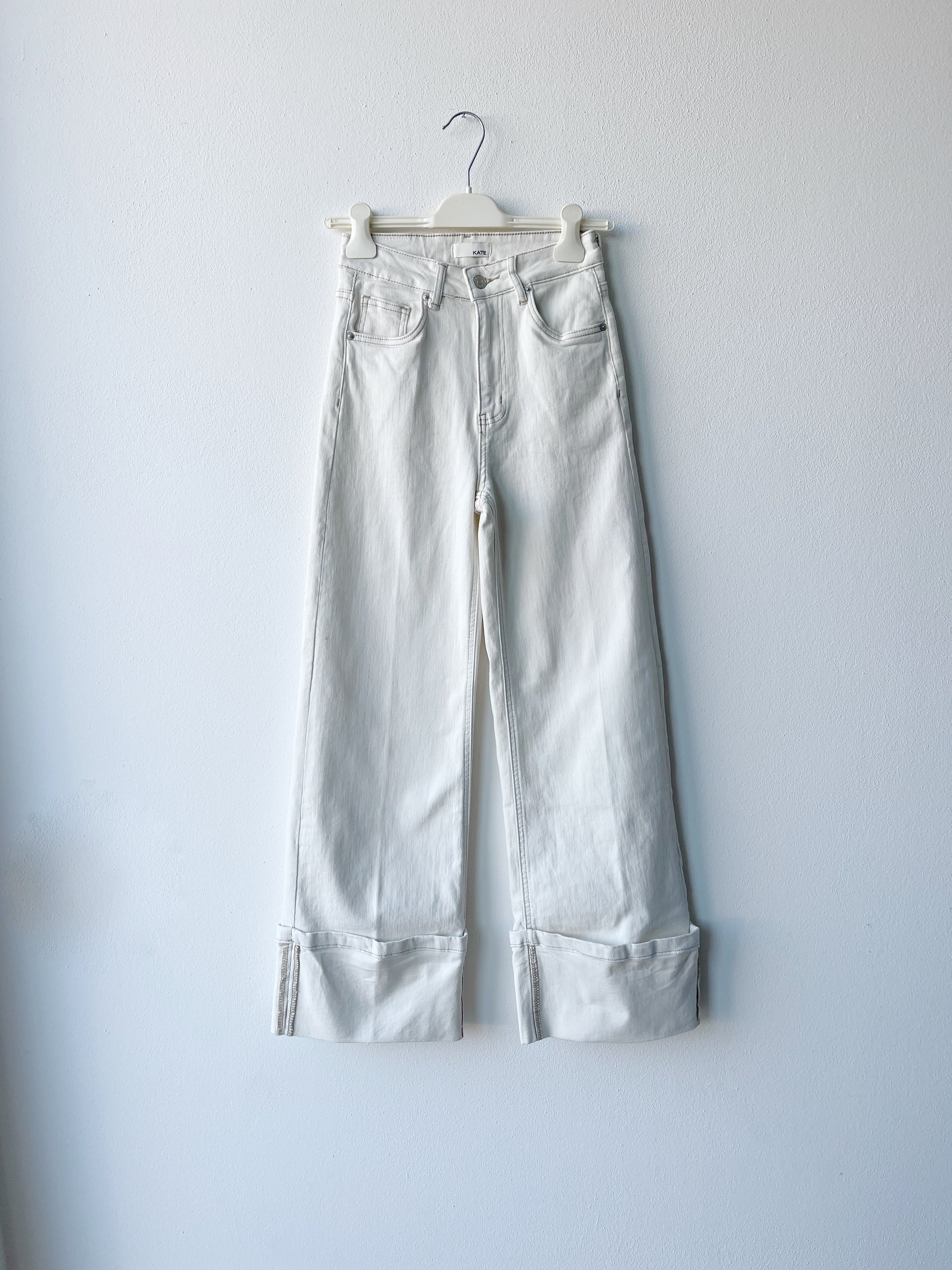 Jeans elasticizzato vita regolare con risvolto cucito ( si puo allungare ) colore bianco burro con cuciture nocciola