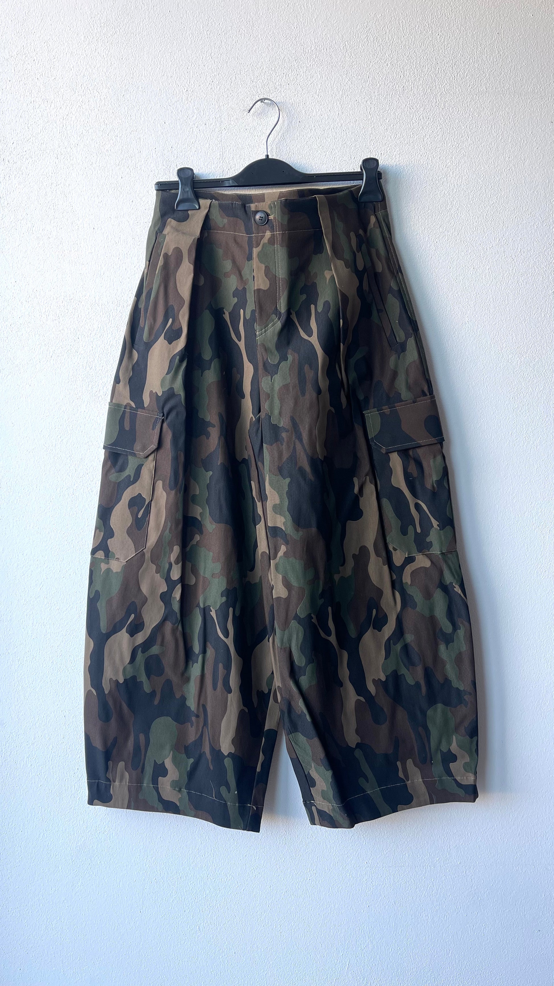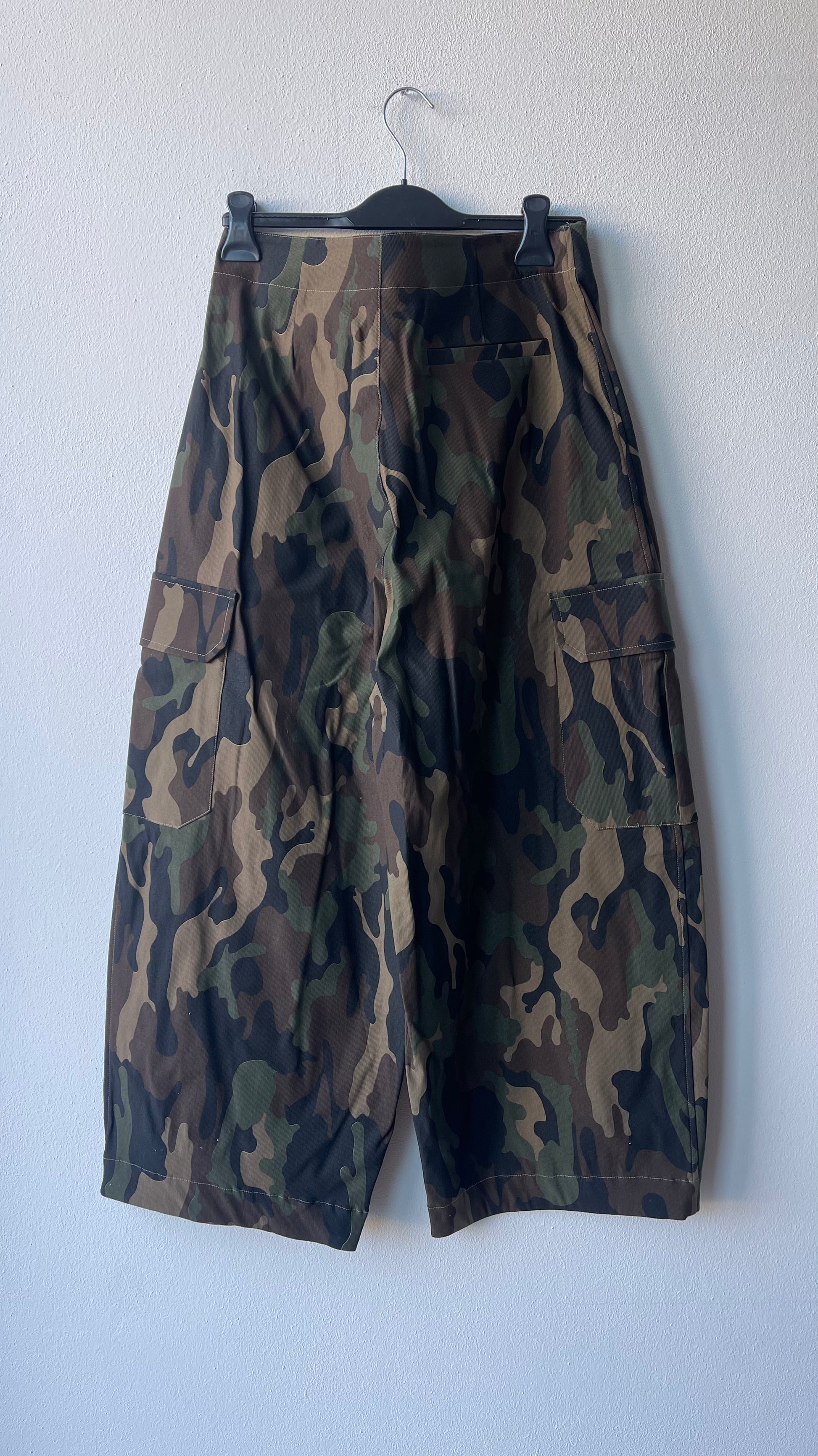 Pantalone tessuto elasticizzato modello cargo gamba ampia con piccole pence sul davanti tasche laterali