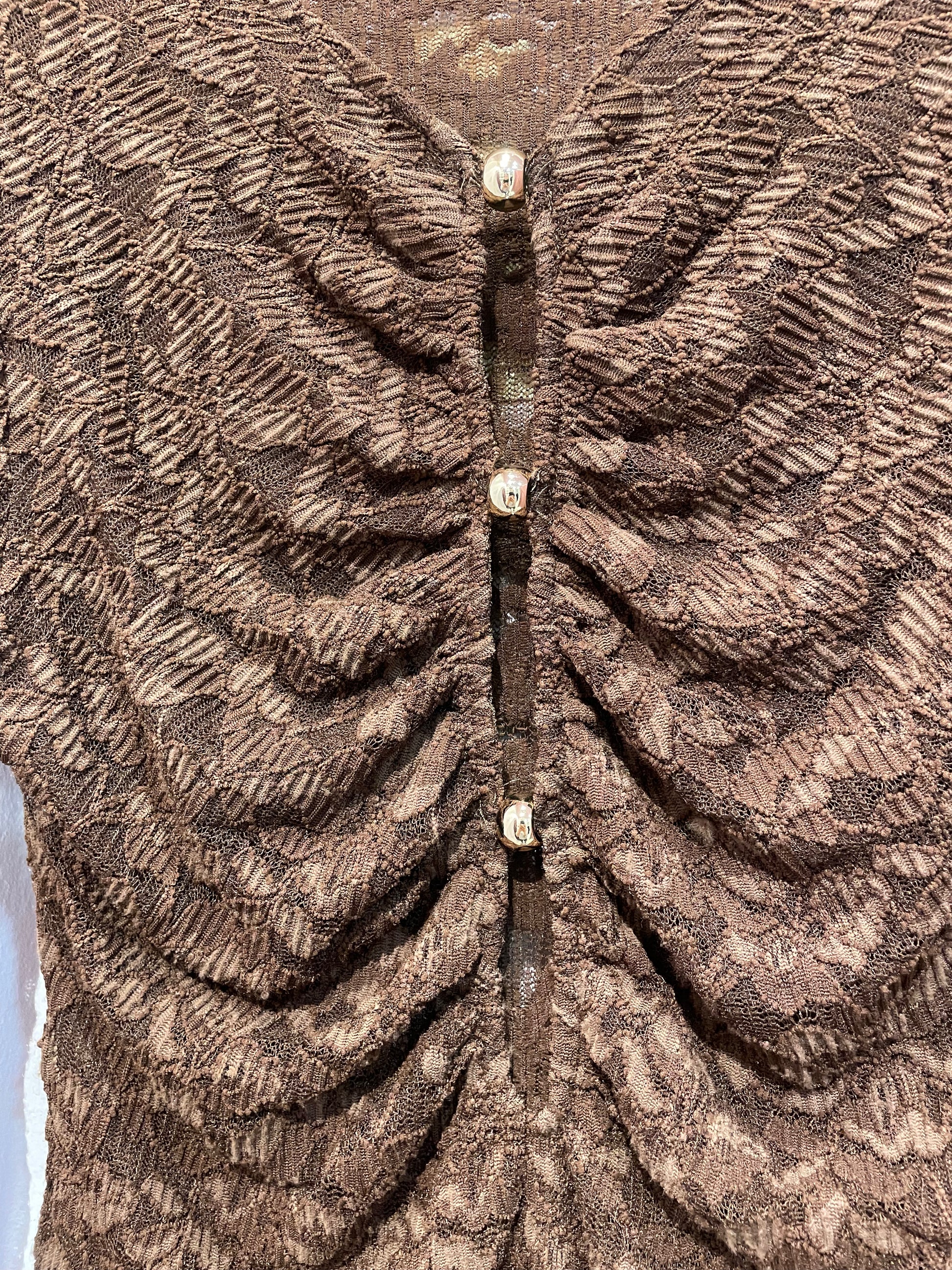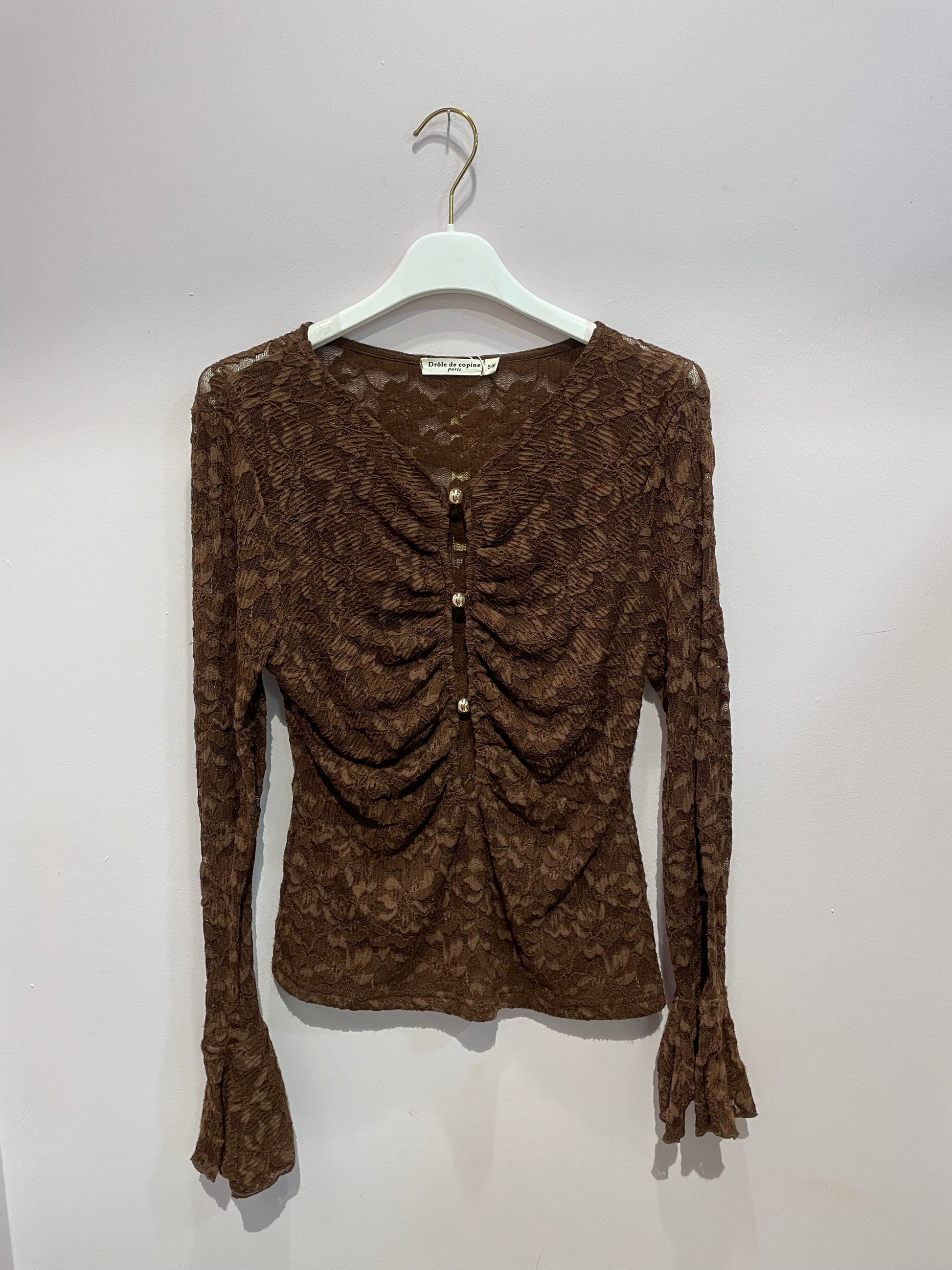 Maglia in pizzo marrone elasticizzata con apertura frontale fermata da bottone dorato e maniche a campana