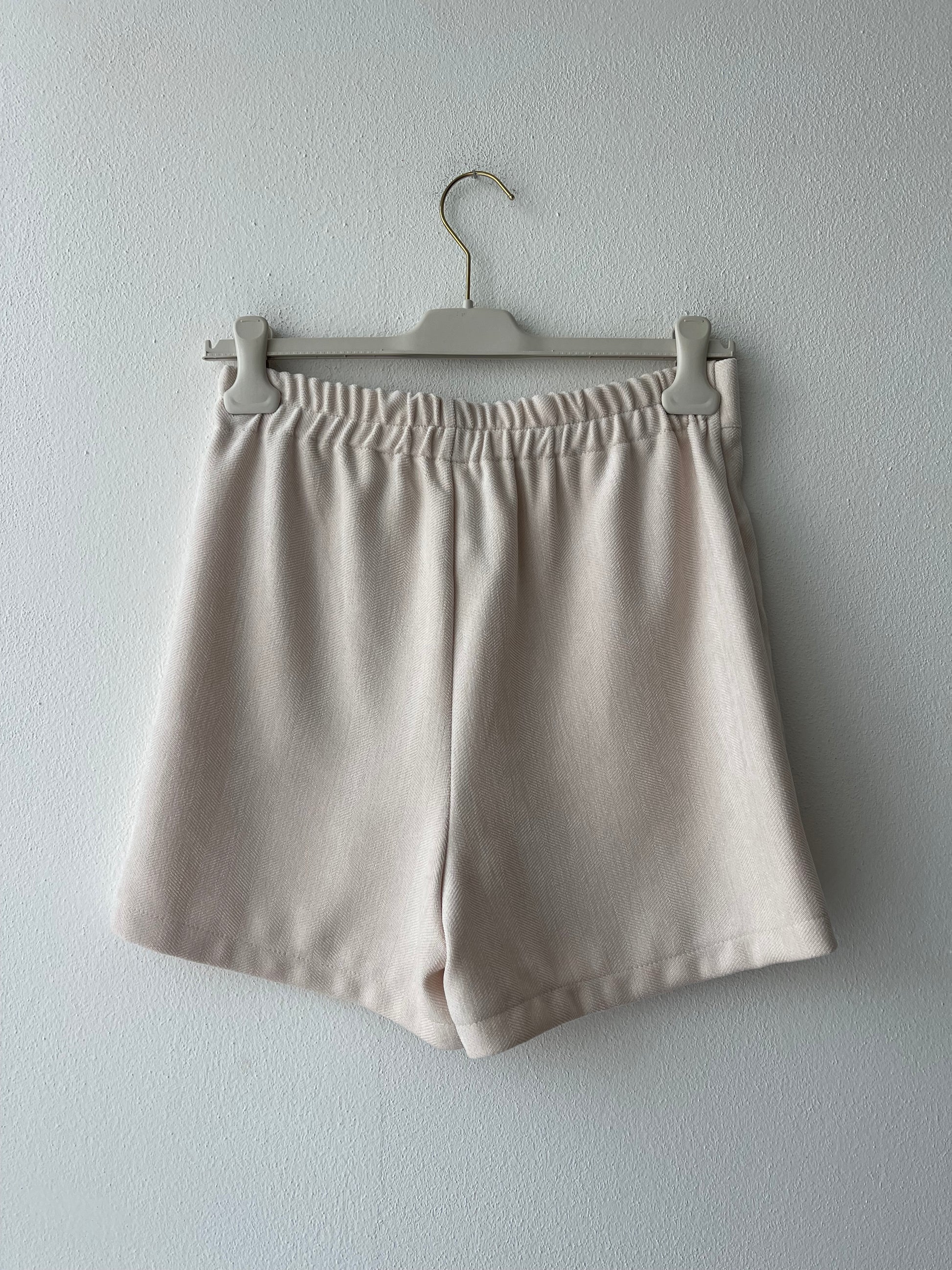 Tailleur bianco cipria con blazer collo a lancia e abbottonatura doppia gonna shorts con elastico nella parte dietro chiusura a portafoglio