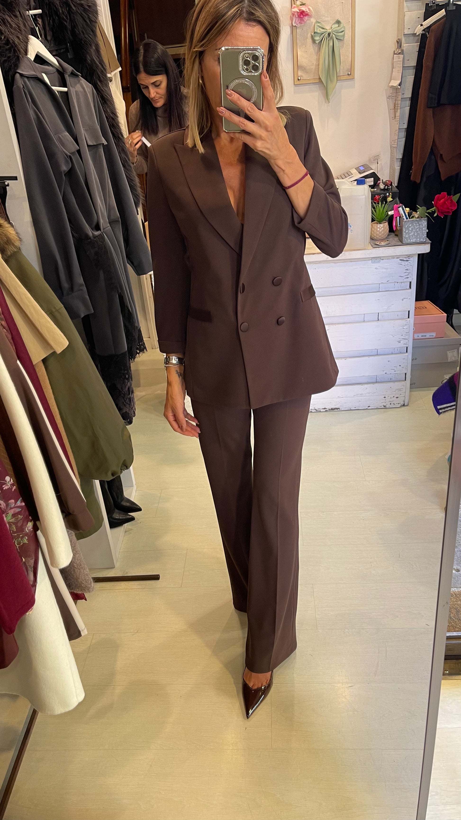 Tailleur giacca doppiopetto allacciatura bassa e pantalone leggermente svasato sul fondo dettagli satin sul collo a lancia e sulle tasche